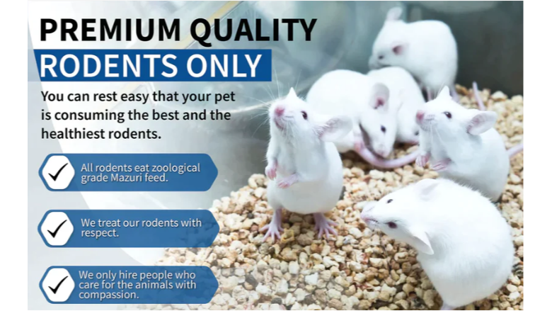 At MiceDirect, these mice are fed Mazuri, a zoological-grade feed, to ensure that the animal is healthy at the time of death. Moreover, because the mice are not sourced from lower-quality imports or lab surplus and are raised in humane conditions, they are disease-free with no risk of medical contamination to the snake.