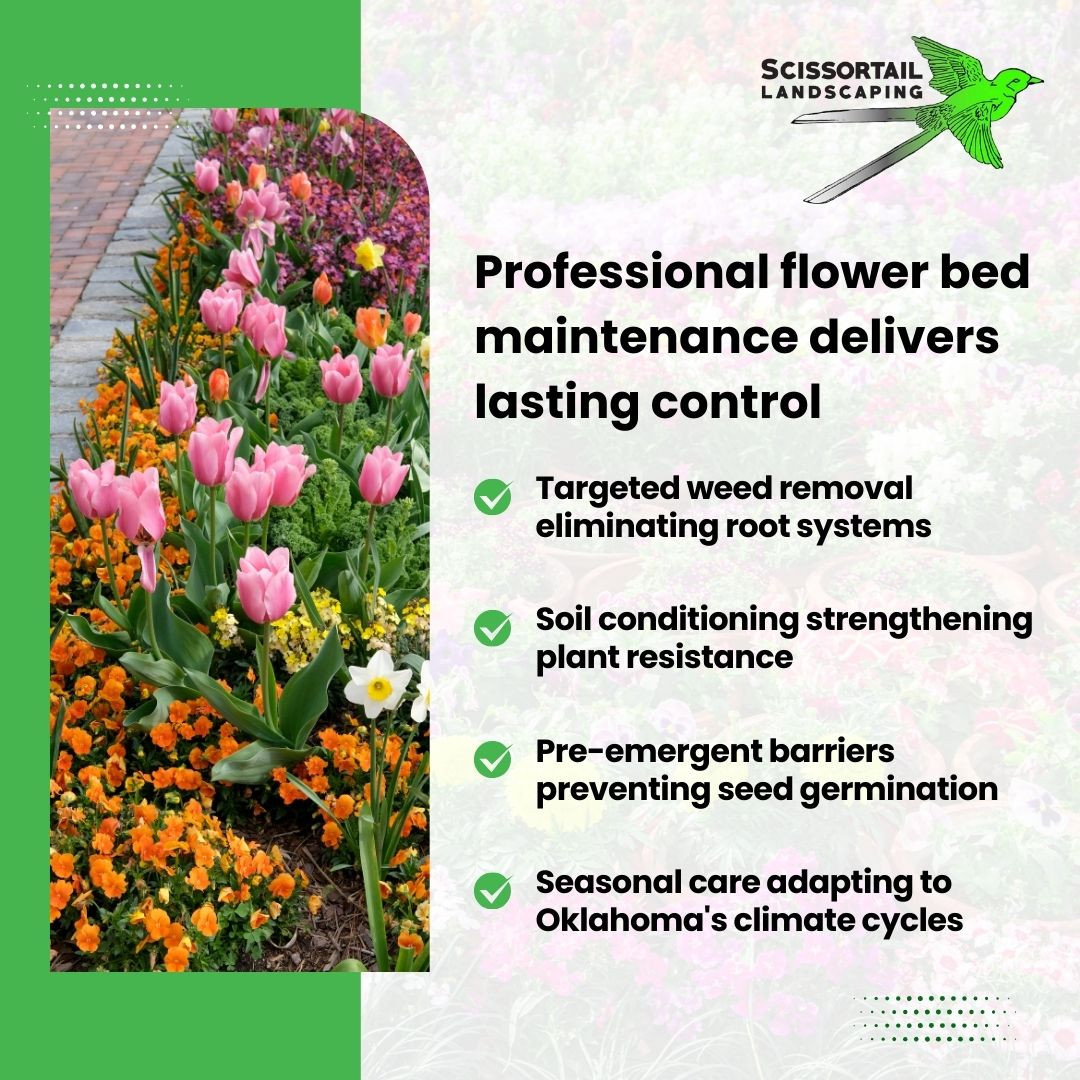Homeowners can take control of weeds and maintain vibrant, healthy flower beds by partnering with Scissortail Landscaping. Services include targeted weed removal, soil conditioning, mulching, and seasonal care. Working with a trusted flower bed maintenance service near Oklahoma reduces labor, lowers ongoing costs, and helps gardens thrive throughout the year.