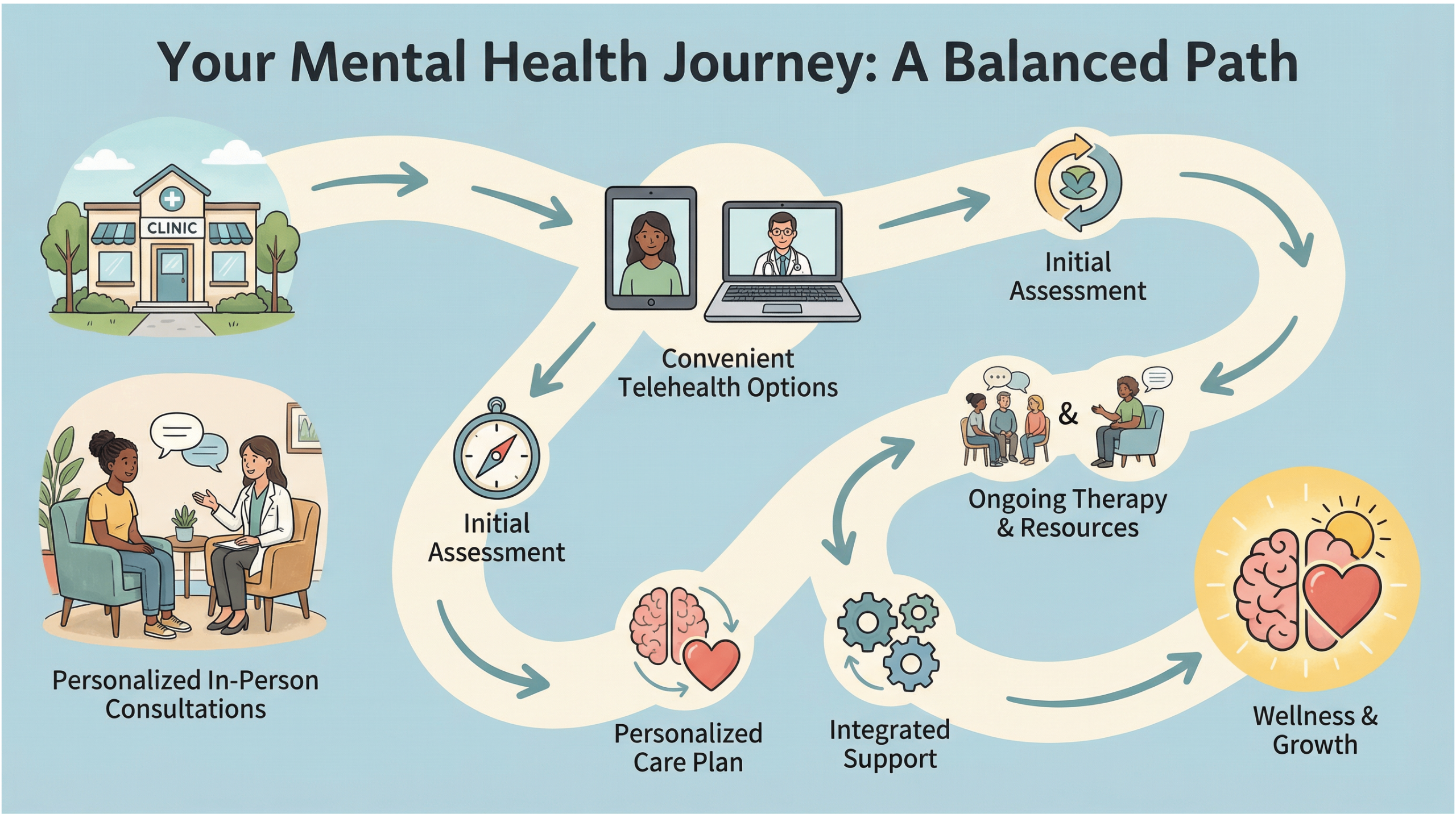 The CarePath model is built on a foundation of accessibility and clinical excellence. It strategically combines traditional in-person consultations with modern telehealth options, offering unparalleled flexibility and convenience. This hybrid structure is designed to meet patients where they are—whether that is in the comfort of their own home via a virtual session or in the professional setting of the Los Alamitos office. By integrating these modes of delivery, Focused Connections Psychiatry ensures that the quality of care remains world-class while removing the logistical barriers that often prevent people from seeking help.