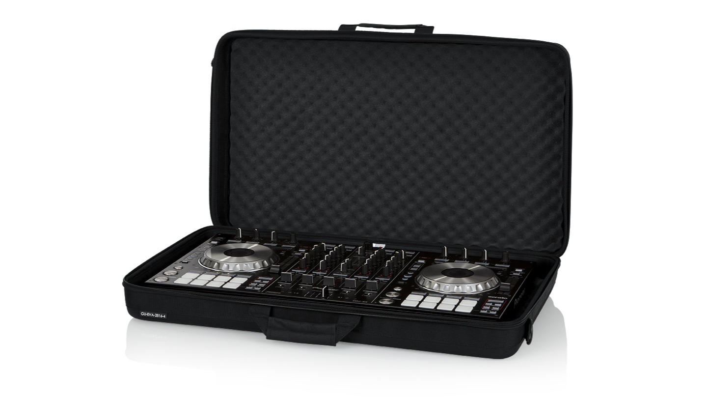 The GU-EVA-2816-4 features a reinforced exterior shell paired with convoluted foam padding that helps absorb shock during transport. An adjustable and removable padded shoulder strap distributes weight across the body, and a reinforced nylon carry handle provides an alternative grip option for short-distance movement. The case accommodates popular controller models, including the Pioneer DDJ-RX, DDJ-SX, and DDJ-SX2, as well as the Native Instruments Traktor S8 and Numark Mixdeck Quad. Sam Ash lists the case’s exterior dimensions as 29 by 17 by 5.75 inches and interior dimensions as 28.2 by 16.3 by 4 inches.