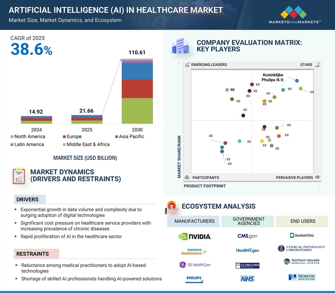 The global artificial intelligence in healthcare market is experiencing explosive growth, valued at $21.66 billion in 2025 and accelerating toward $110.61 billion by 2030, representing a compound annual growth rate (CAGR) of 38.6%, according to new market analysis. This expansion reflects a fundamental shift in how healthcare organizations are addressing chronic disease management, diagnostic precision, and operational efficiency at scale.